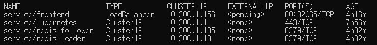 redis-leader ClusterIP 10.200.1.13 <none> 6379/TCP 4h37m