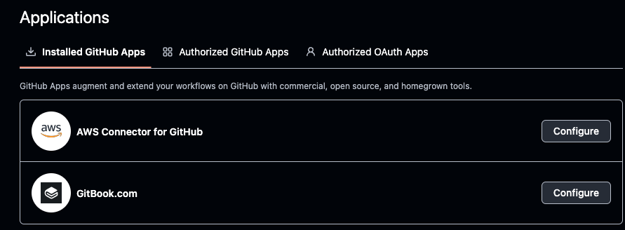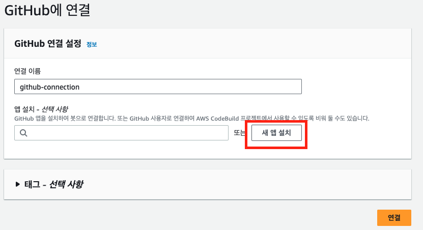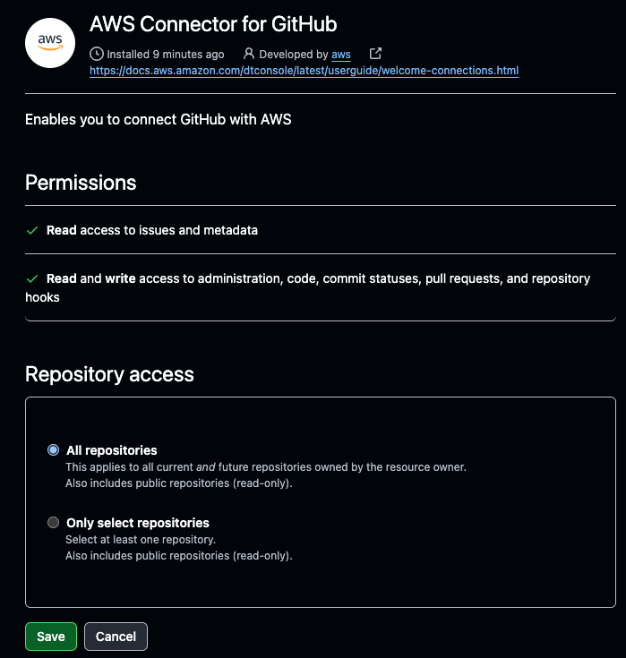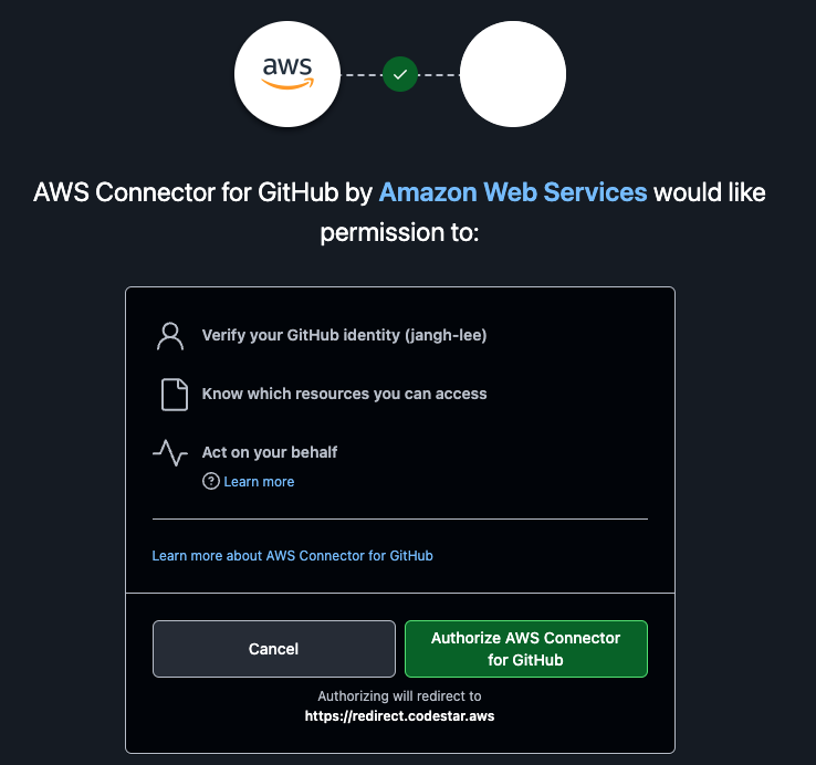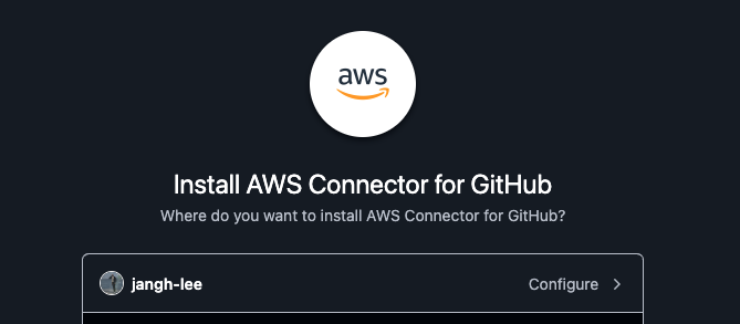 그럼 해당 브라우저 세션에서 가지고 있는 깃허브 페이지 로그인정보와 연동되어 github와 aws의 connector 앱을 설치합니다.