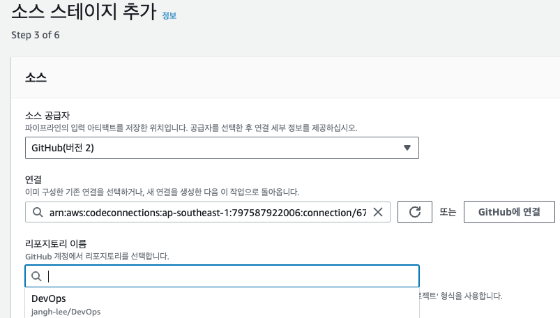 설정이 완료되면 이제 codepipeline에서 소스항목에서 소스공급자로 선택하고 사용이 가능합니다.