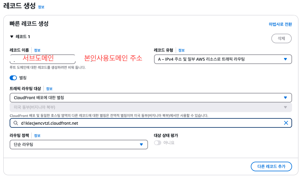 A레코드에서 라우팅 대상을 CloudFront로 두고 CloudFront ID를 선택합니다.