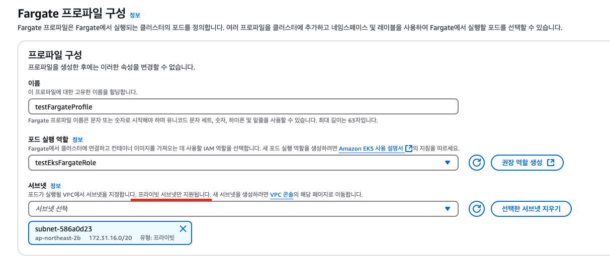 Fargate를 특정 서브넷에 할당할 수 있습니다. 따라서 해당 프로파일로 생성되는 모든 Pod는 여기서 지정된 서브넷으로 들어갑니다.