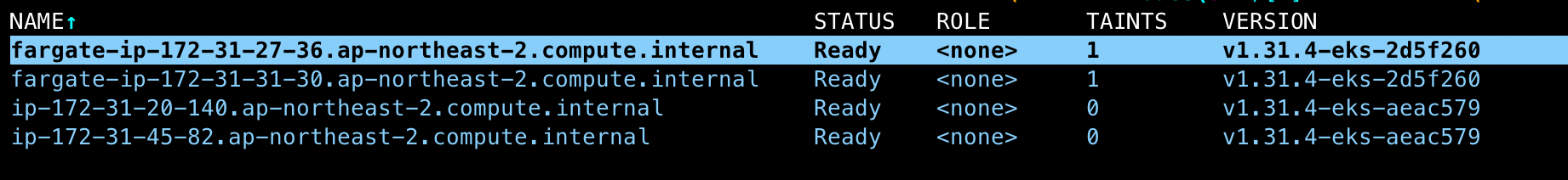 node로 검색해보면 다음과 같이 보이는데, 위 2개는 fargate이고 아래 2개는 nodegroup입니다.