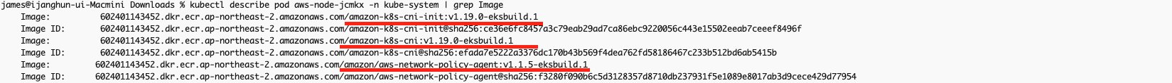 aws-node라는 이름이 AWS VPC CNI 역할을 하는 pod이다. 이렇게 describe를 해보면 알 수 있다.