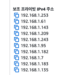 노드 1의 정보는 192.168.1.143이 새로 생겼고 이 또한 보조 private IP에서 나온것을 확인할 수 있다.