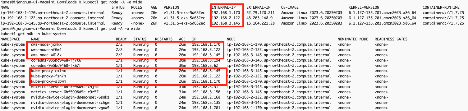 둘째로 aws-node, kube-proxy의 경우 node와 같은 IP를 가지는데, 이는 노드 내에서 포트로 구분되고 있기 때문이다.