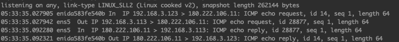 05:21:27.365927 ens5 Out IP 192.168.2.24 > 192.168.3.123: ICMP echo request, id 25, seq 2, length 64