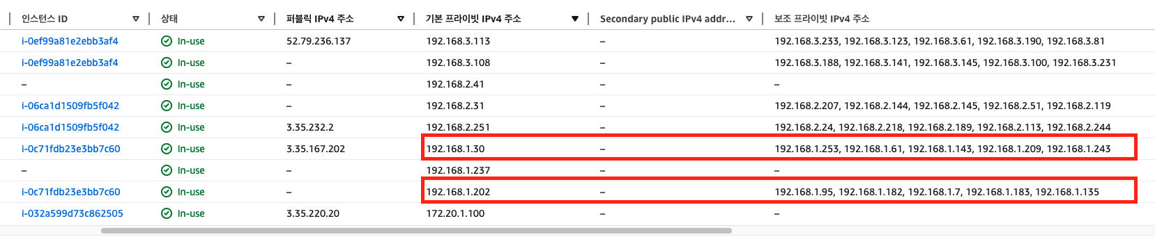 ENI에서 확인해봐도 실질적으로 ENI당 5개의 보조 IP를 받은것을 확인할 수 있다.