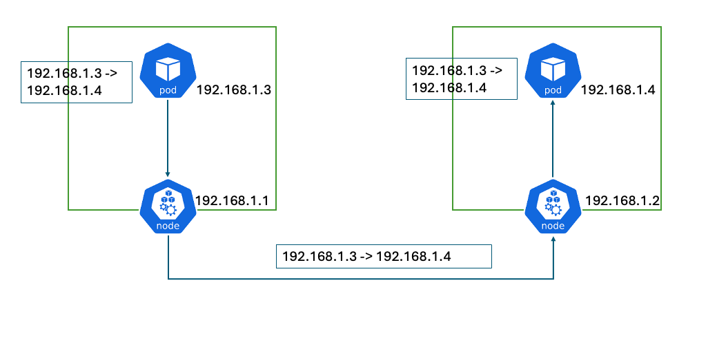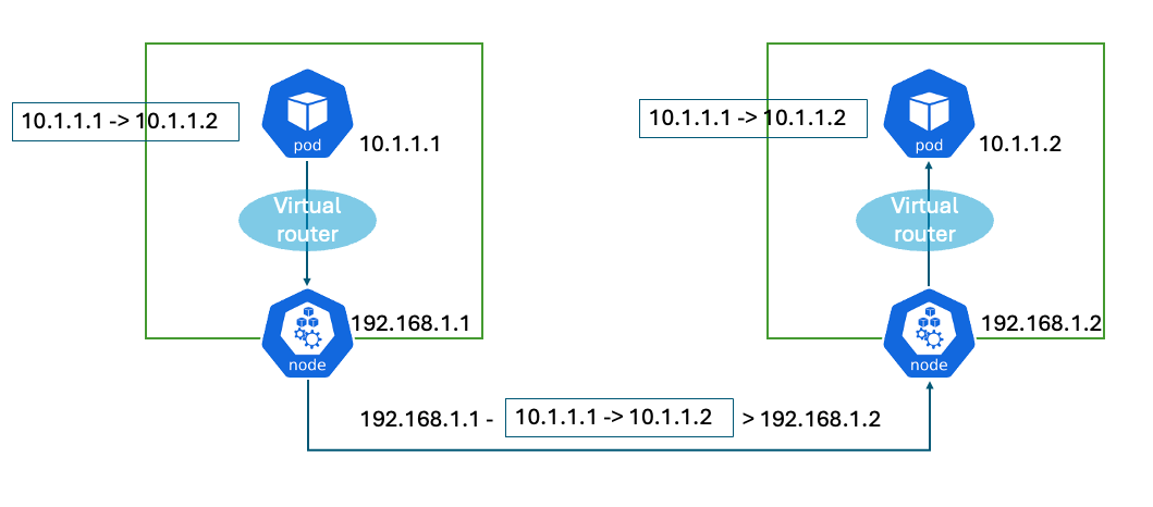 아래 그림과 같이 파드 간 통신시 일반적으로 쿠버네티스 CNI는 오버레이 통신을 한다.