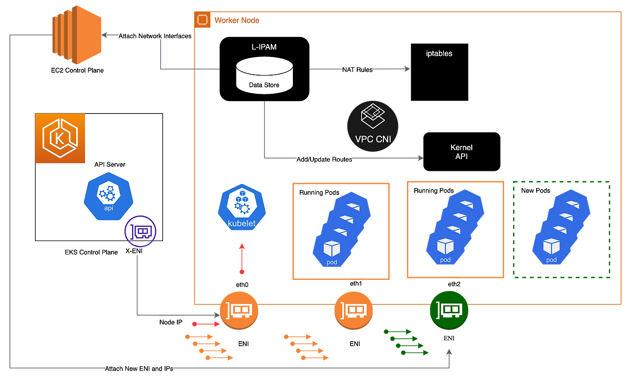VPC CNI는 L-IPAM을 가지고 있어, 이를 통해서 VPC 대역의 일부 IP pool을 가지고 있으면서 여기서 할당받아서 사용하게 된다. 그렇기 때문에 pod의 IP를 매우 빠르게 받아갈 수 있도록하였다.(fast start)