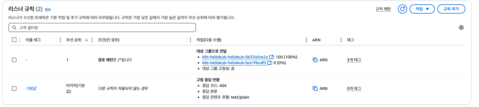 서비스가 로드밸런서 타입이기 때문에 로드밸런서가 실제로 생성되었고, 연결된 pod에 맞게 타겟그룹이 생성되었다.