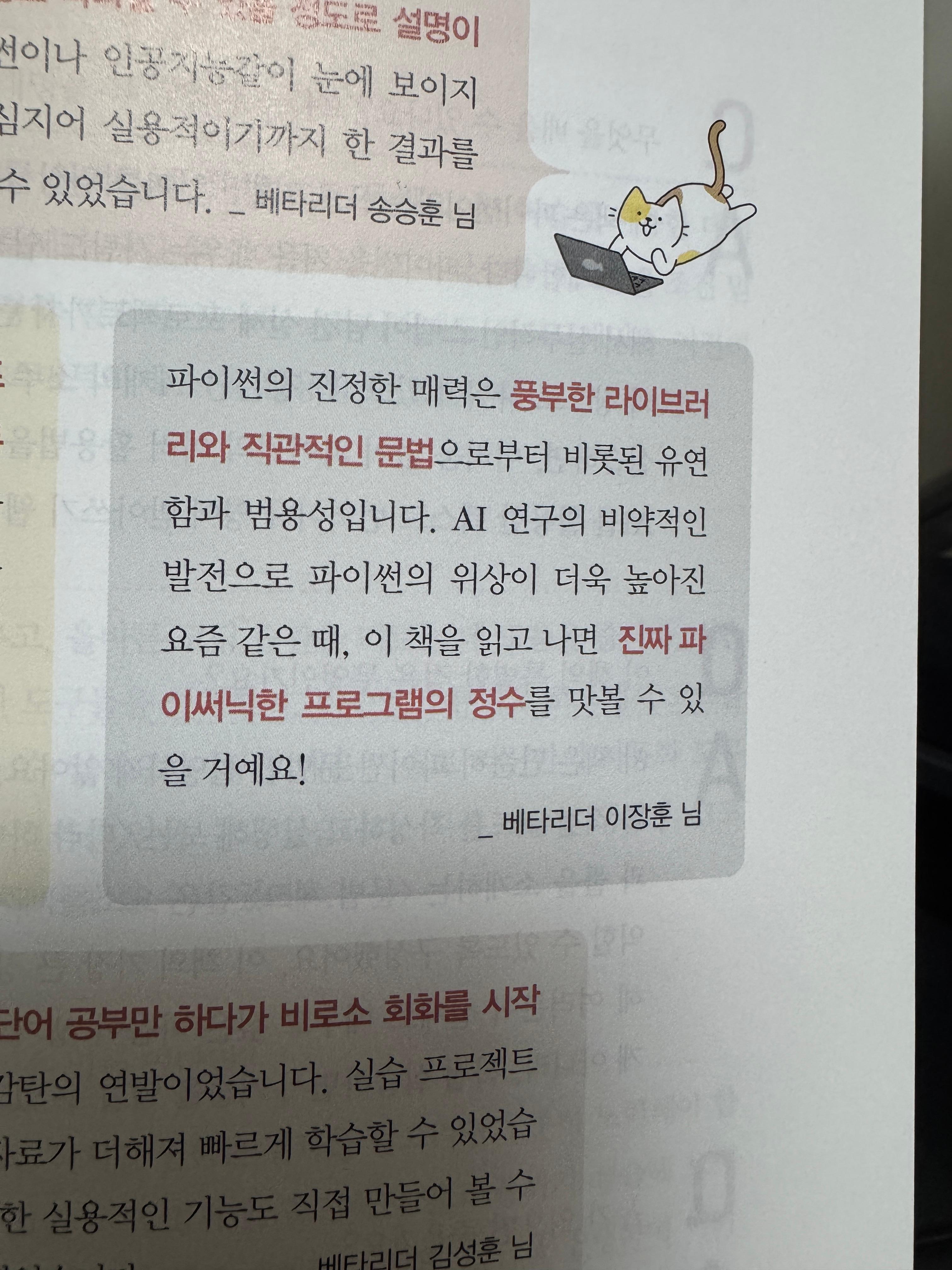 나는 참고로 이 책의 베타리더로 먼저 읽어보게되었고, 읽는 동안에도 너무 좋았다. 왜냐하면 내가 파이썬을 요즘 많이 활용하고 있고, 개인적으로 AI를 활용하면서 정말 많이 공부하면서 사용하기 때문이다.