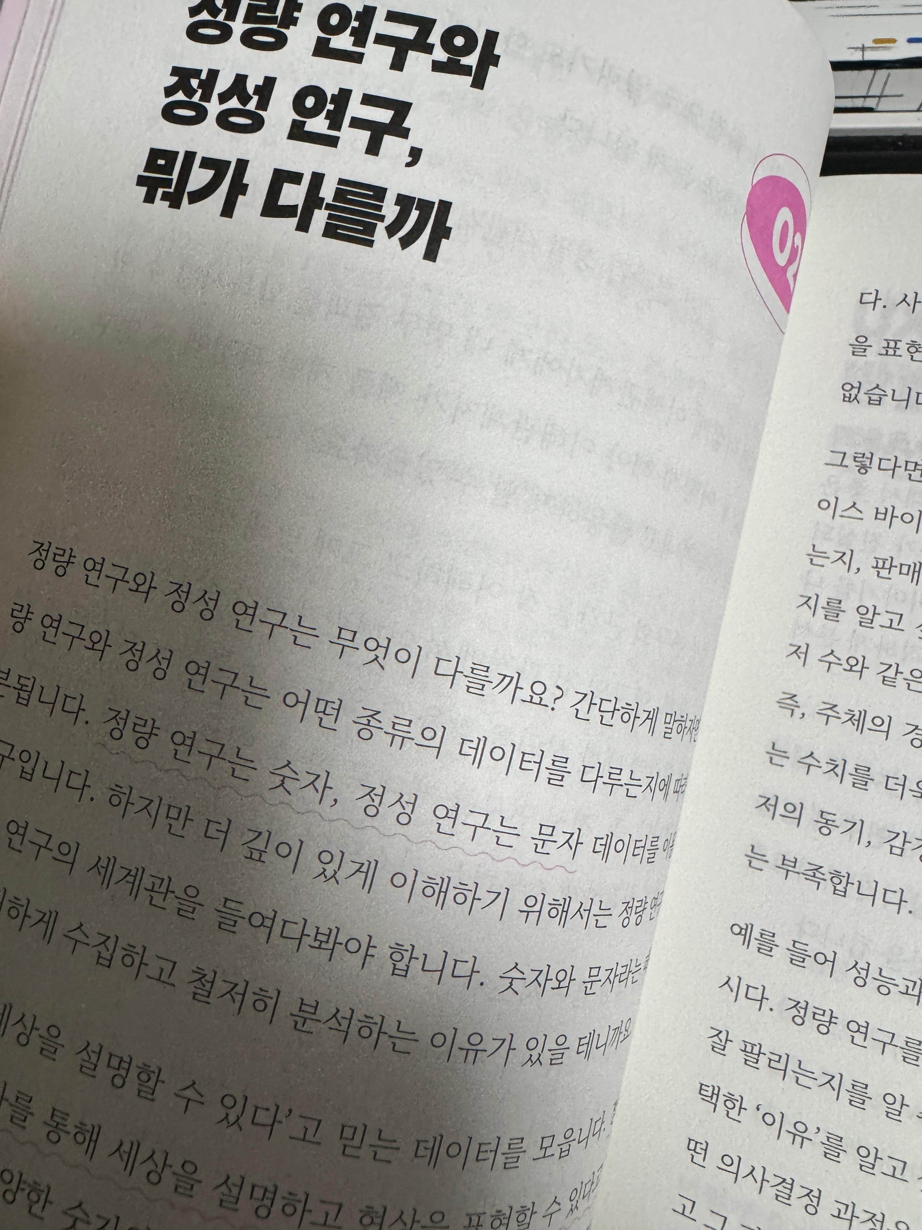 특히 초반에는 정성연구란 무엇이고 어떤 방식으로 어떻게 구성해야하는지에 대해서 명확하게 서술하고 있다. 주로 비교되는 개념은 정량연구인데 이 둘 중에 뭐가 좋다라고는 할 수 없고, 자신에게 맞는 방법은 무엇인지 책을 통해서 고민해봐야한다. 이런 고민은 결국 가장 중요한 기본부터 닦아나가는 것임을 다시 한 번 느낀다.