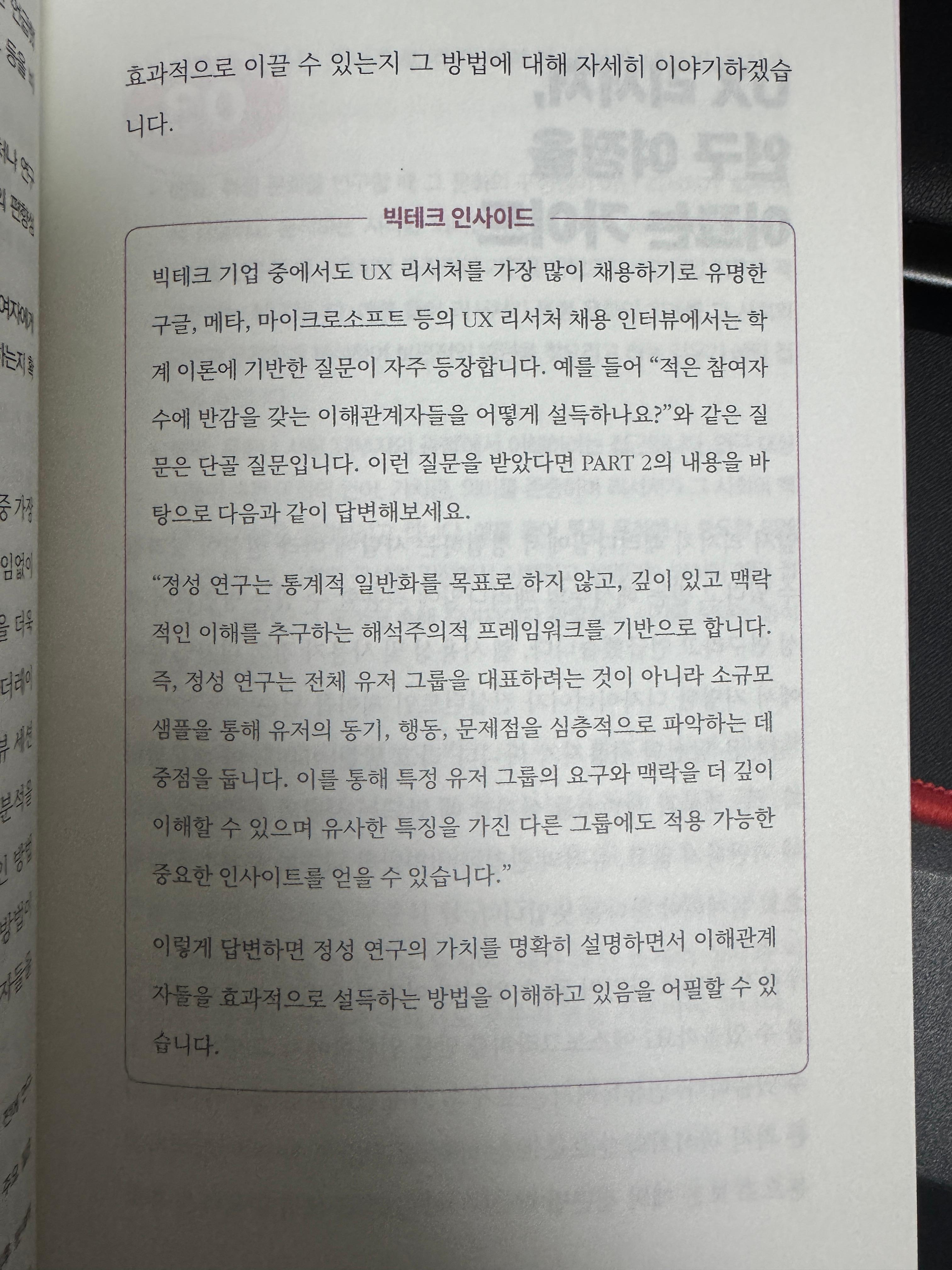 책에는 중간중간 실무적인 내용이나 면접을 위한 팁 등 주니어 리서처 혹은 리서처를 희망하는 사람들에게 실무적인 내용을 많이 담아두기도 했다. 특히나 한국어로 한국인 저자가 적은 책이기 때문에 우리의 시각으로 외국 회사를 바라보는 관점도 좋으며, 실무적인 이야기를 들을 수 있는 책이라서 의미가 있었다.
