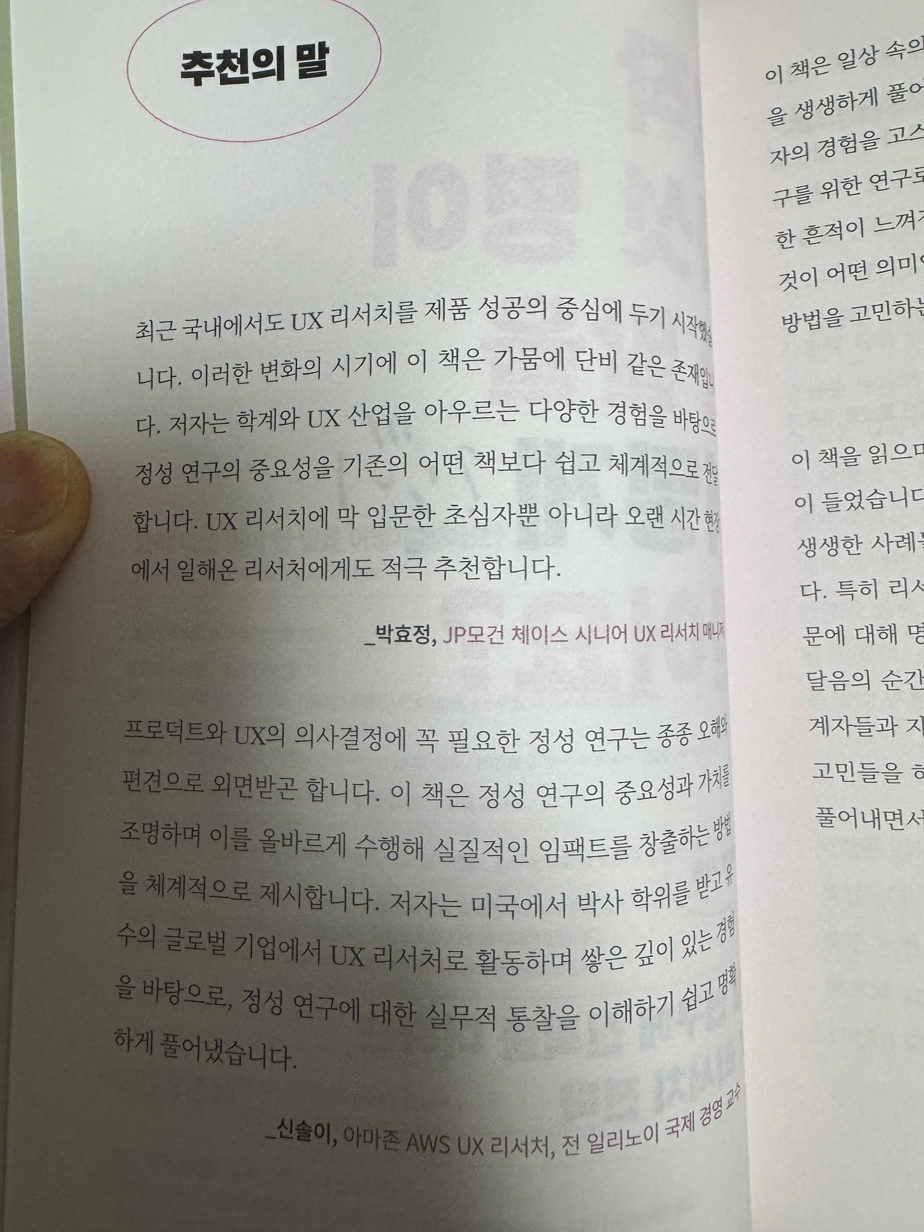 그리고 화려한 커리어에 맞게 추천의 말 써주신 분들을 보면 다 우리가 아는 대기업들의 UX 리서처들의 추천을 받았다. 이것도 능력이라고 본다.