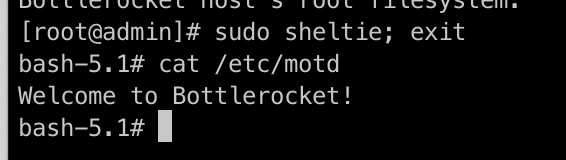 이제 admin 컨테이너에서 sheltie 스크립트를 실행하여 Bottlerocket 호스트의 루트 파일시스템에 접근 가능한 권한을 사용할 수 있도록 해보자.