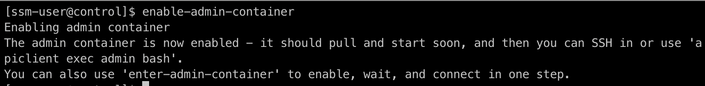 다시 원래대로 SSM으로 돌아와서 admin container를 활성화 시켜보자. 기본적으로는 비활성화 상태이므로 다음 명령어를 통해서 실행해줘야한다. admin 컨테이너는 시스템 디버깅이나 루트의 작업을 요하는 경우 혹은 추가적인 네트워크 경로 등을 필요로 하는 경우에 액세스를 제공한다.
