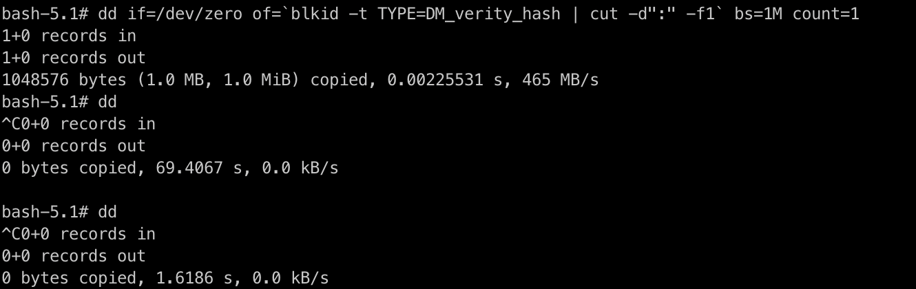 sheltie로 접근한 경우 루트 쉘을 사용하게 되며 dm_verity_hash에 있는 블록을 덮어쓰기해보도록 한다. 변경사항을 가하는 행위이다.