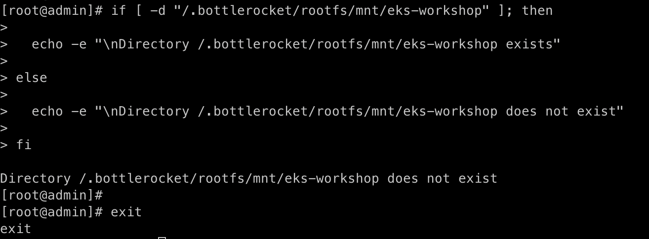 echo -e "\nDirectory /.bottlerocket/rootfs/mnt/eks-workshop does not exist"