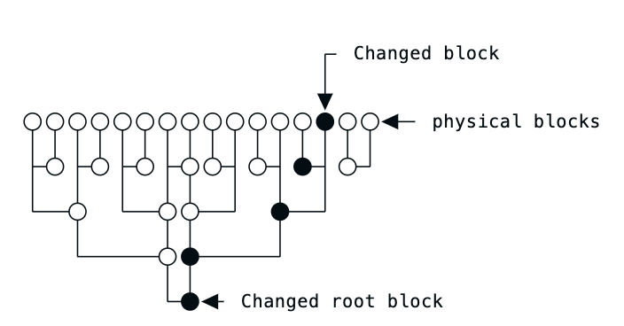 각 물리적인 블록에 대해 암호화된 해시 값을 계산하고, 이 해시 값들의 결합으로 루트 블록의 해시를 계산한다.