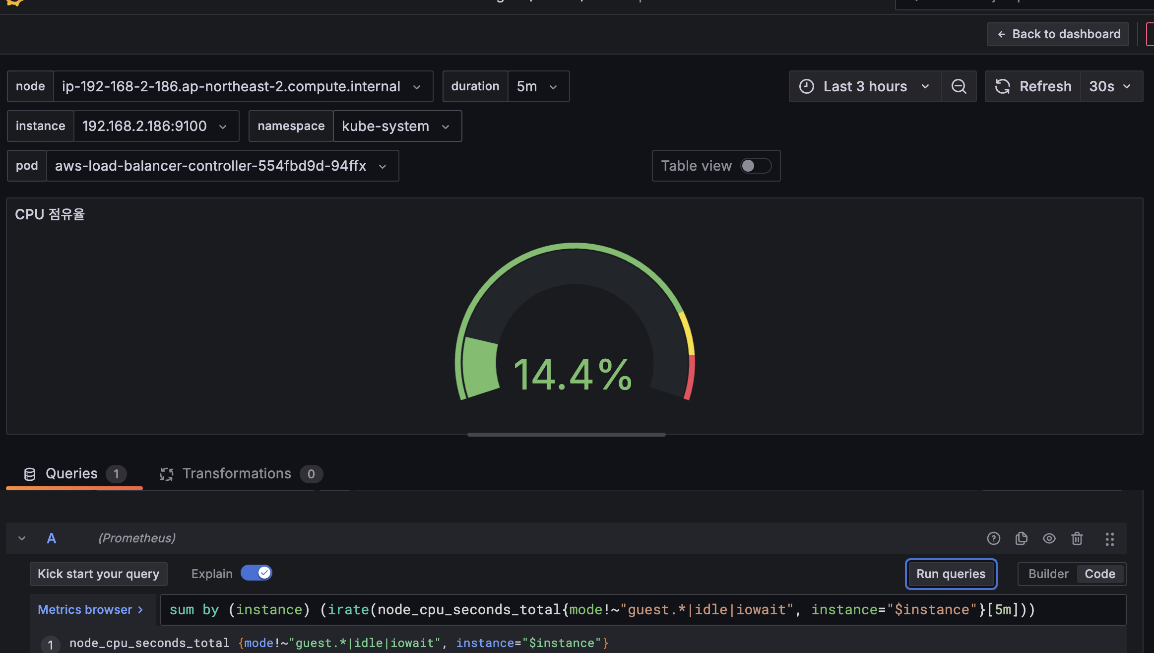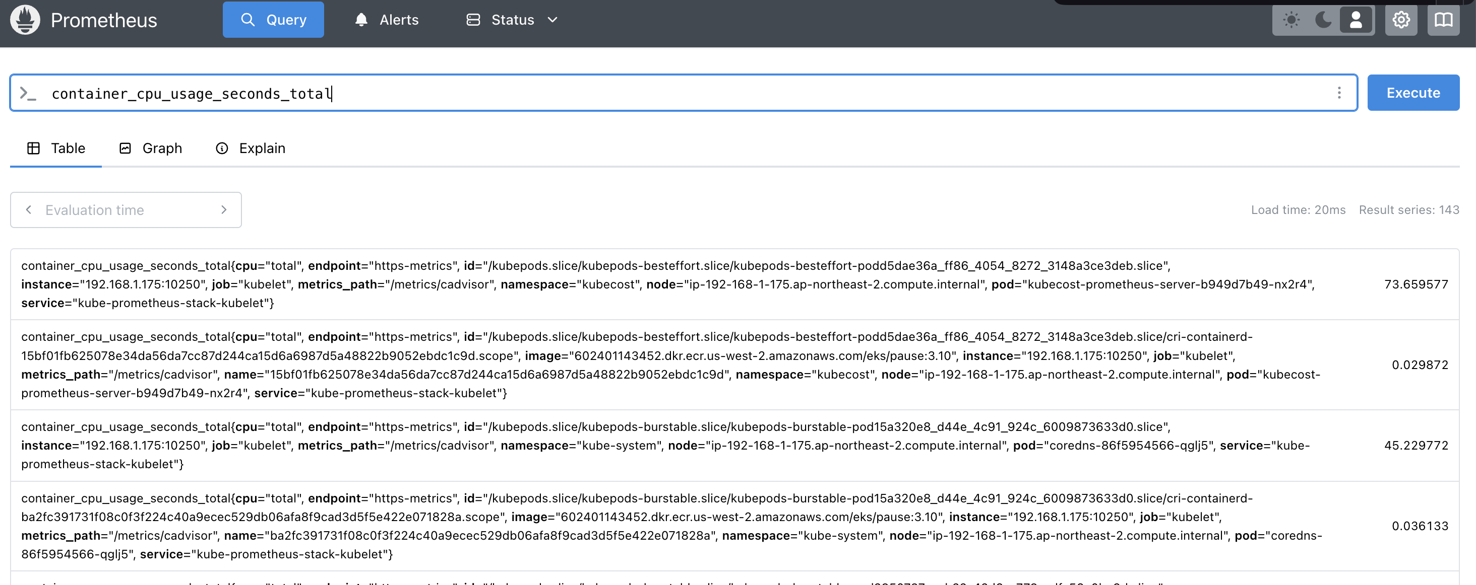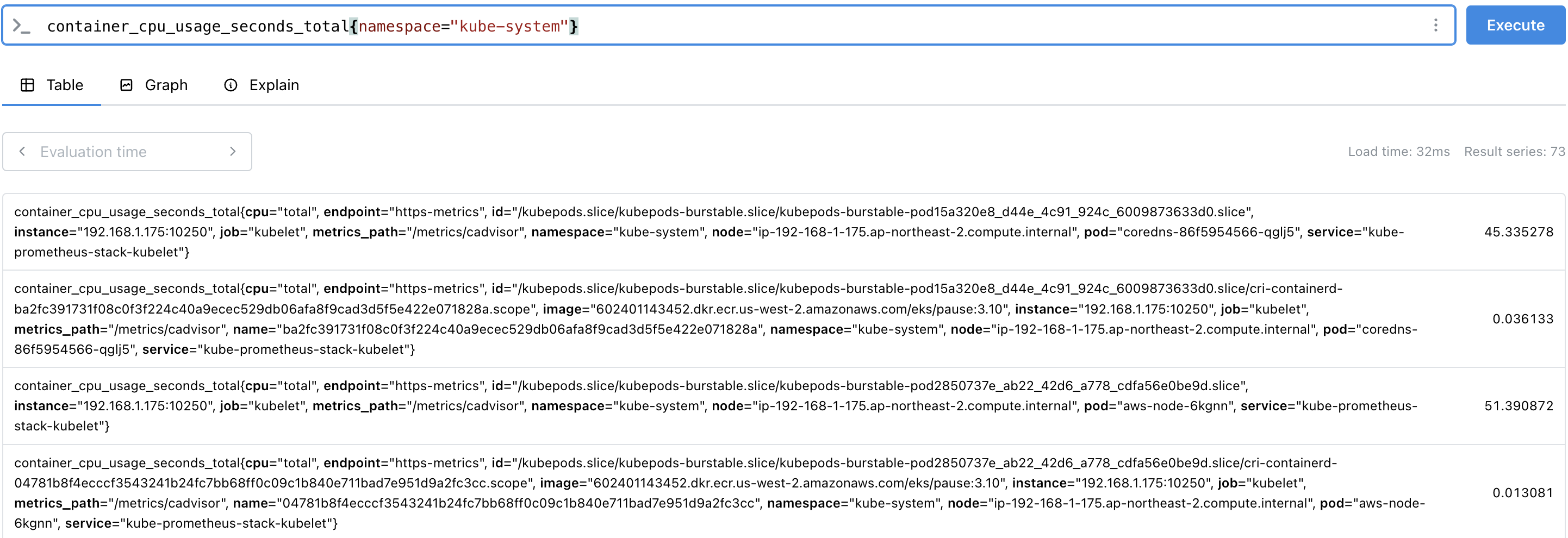 PromQL은 다양하게 활용할 수 있다. 다음과 같이 컨테이너 cpu 사용량을 확인할 수 있습니다.