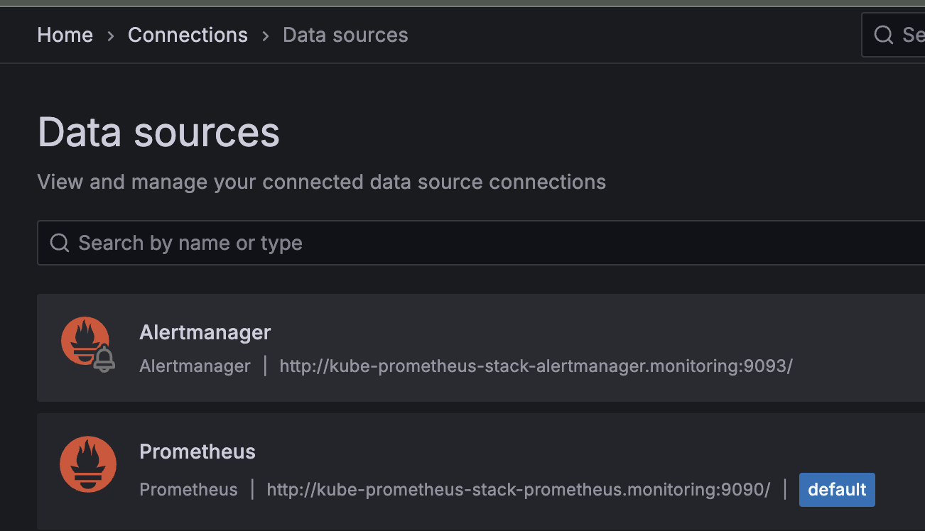 그라파나에서는 data sources를 등록해야만 볼 수 있는데 이미 prometheus가 등록된것을 확인할 수 있습니다.
