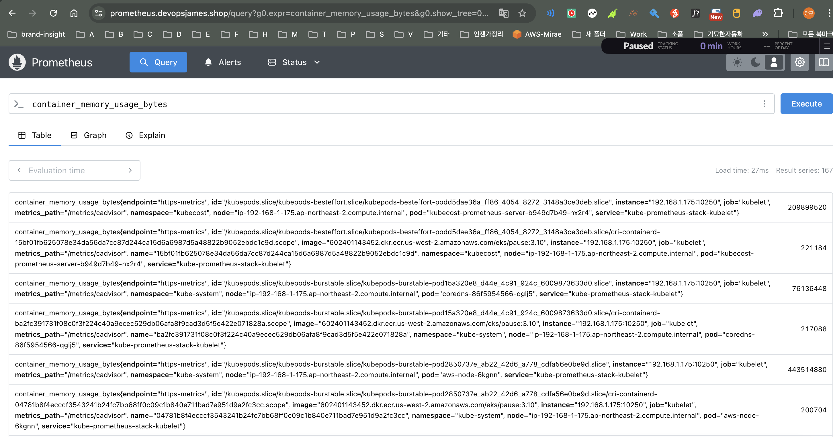 일단 먼저 prometheus 부터 들어가보자. Query에서 간단히 container_memory_usage_bytes를 조회해도 잘 나오는 것을 확인할 수 있습니다.