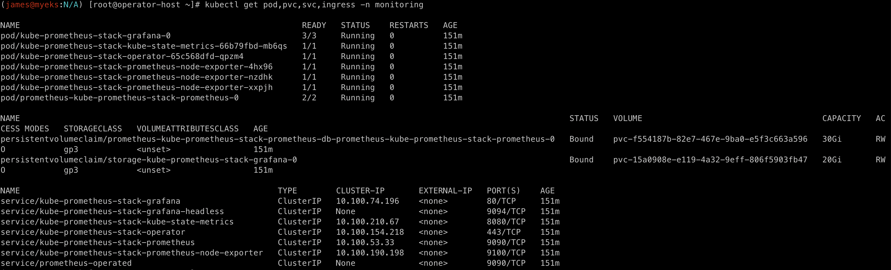 kubectl get pod,pvc,svc,ingress -n monitoring