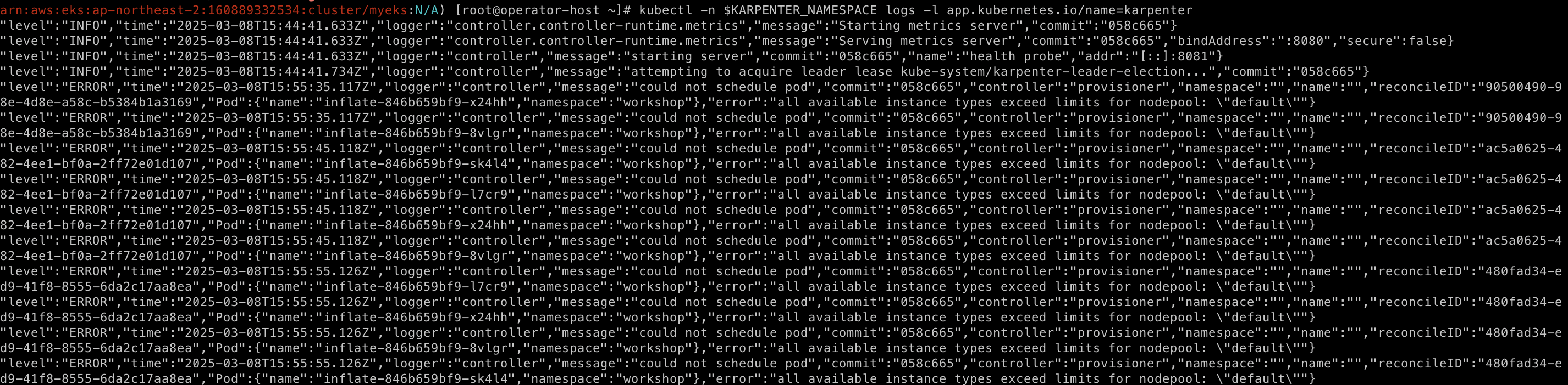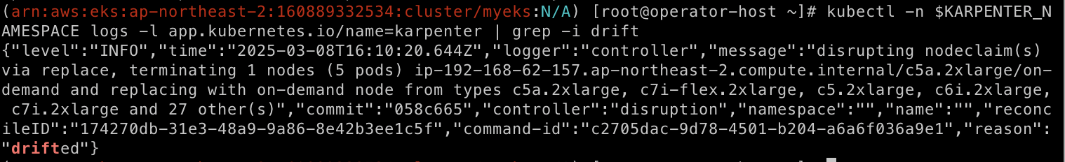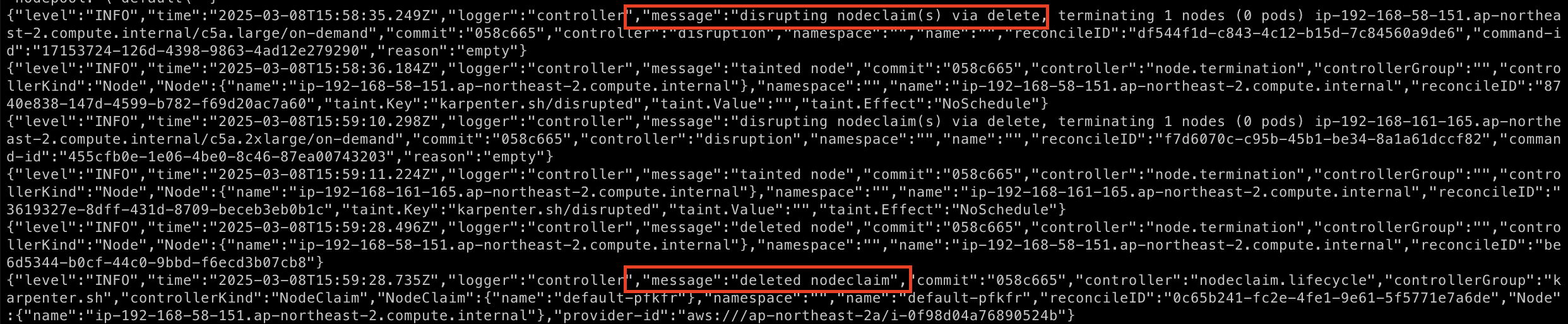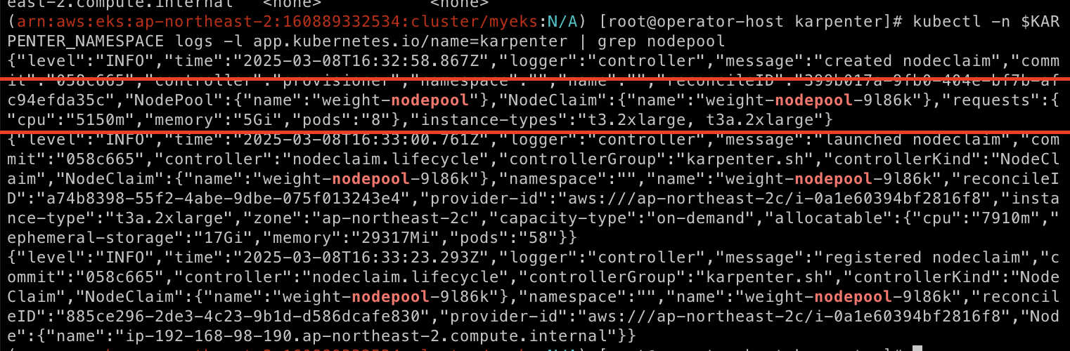 다음 명령어를 통해서 karpenter 로그를 확인해볼 수 있다.