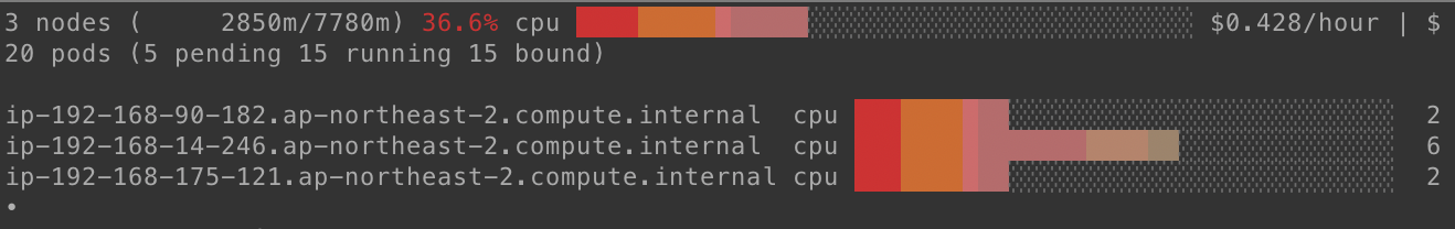 현재 클러스터에 몇 개의 노드가 있는지 확인한 뒤, 스케일 적용을 해보자. pod가 1개 증가하면서 5개의 pending 파드가 실행된 것을 확인할 수 있다.