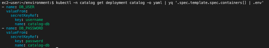 kubectl -n catalog get deployment catalog -o yaml | yq '.spec.template.spec.containers[] | .env'