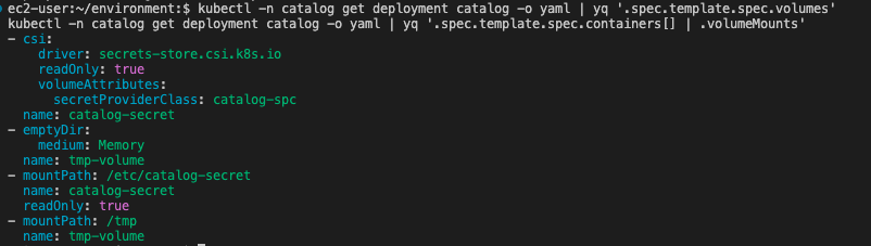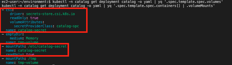 해당 내용을 통해서 CSI 드라이버를 이용해 이전에 검증한 SecretProviderClass로 AWS Secret Manager의 시크릿을 Pod 내부에 /etc/catalog-secret 마운트 경로 마운트 합니다. 이를 통해서 Pod에 반영되게 됩니다.