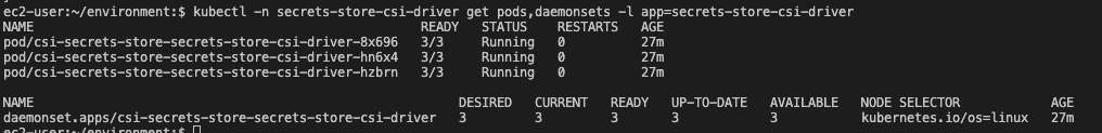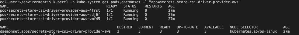 kubectl -n kube-system get pods,daemonset -l "app=secrets-store-csi-driver-provider-aws"