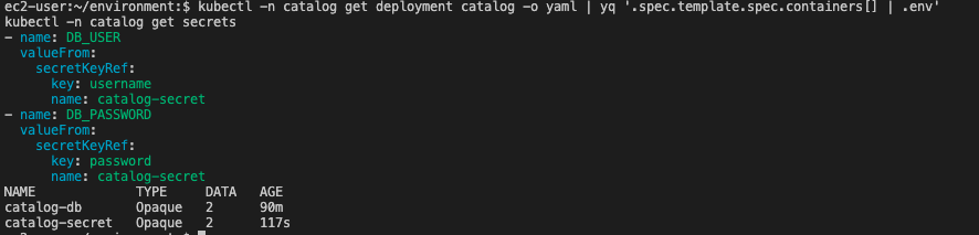이제 pod에 실제 값을 마운트해보겠습니다. 먼저 catalog 배포와 catalog 네임스페이스의 기존 시크릿을 살펴보겠습니다.