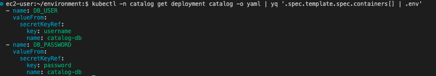 kubectl -n catalog get deployment catalog -o yaml | yq '.spec.template.spec.containers[] | .env'