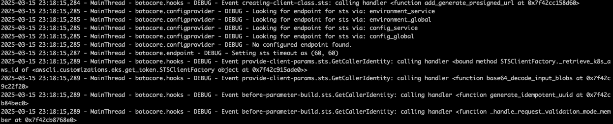 다음 명령어를 통해서 디버그도 해볼 수 있습니다. 보면 sts 쪽으로 요청을 진행하는 것을 확인할 수 있습니다.
