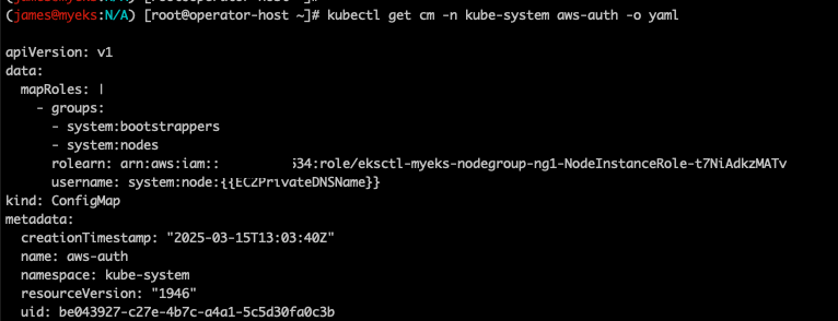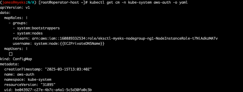 IAM에서 다시 반환하게 되는 IAM User/Role이 확인되면 쿠버네티스 aws-auth configmap에서 mapping 정보를 확인하게 됩니다.