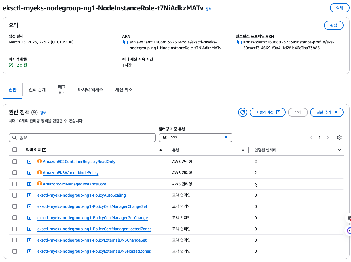 실제로 콘솔에서 봐도 EKS 관련 권한 정책이 많이 설정되어 있는 것을 확인할 수 있습니다.