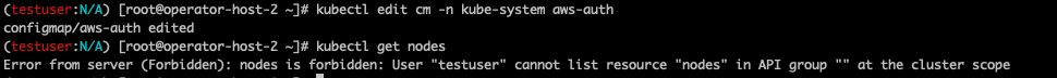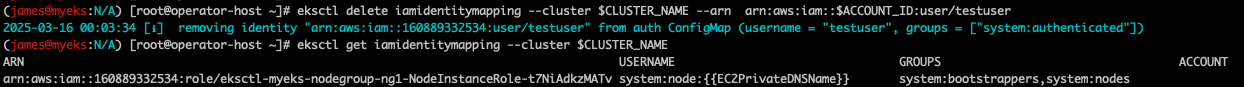 iamidentitymapping을 없애버리면 알아서 바로 configmap에서도 빠지게되고 바로 접근도 불가능하게 됩니다.