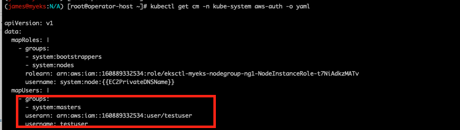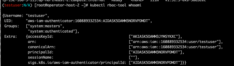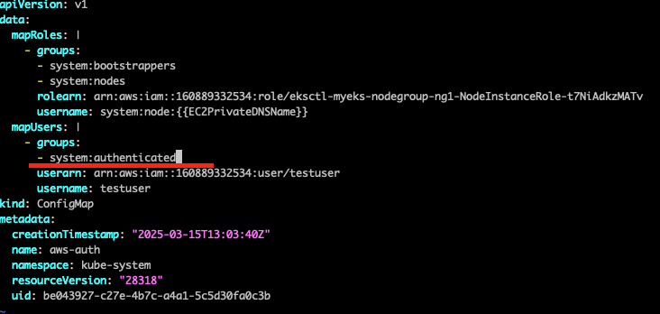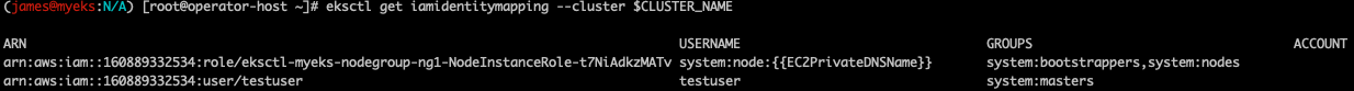 eksctl create iamidentitymapping --cluster $CLUSTER_NAME --username testuser --group system:masters --arn arn:aws:iam::$ACCOUNT_ID:user/testuser