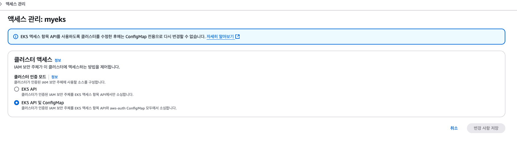 콘솔상 EKS > 액세스 탭에 들어가보면 클러스터 액세스 방식을 선택할 수 있습니다. 기본적으로 인증시스템은 원래 aws-auth라는 configMap을 통해서 허용했으나 점점 aws-auth는 deprecate 시키고, EKS API를 통한 방식으로 이동하는 추세입니다.