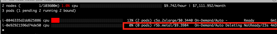 인스턴스 타입도 갑자기 극단적으로 c5a.large -> c5a.2xlarge -> r5b.metal로 원하는 pod가 모두 들어갈 수 있는 node로 급격하게 띄웠습니다.