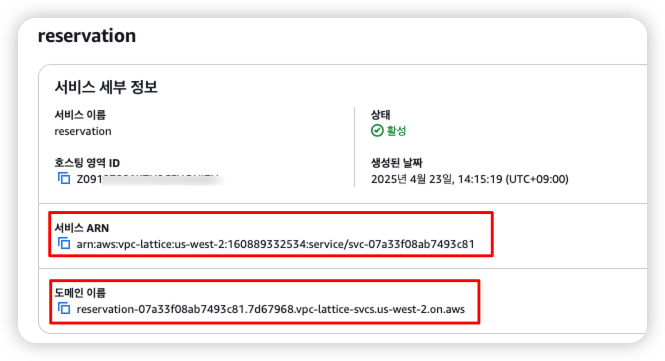 최초 VPC Lattice 서비스로 이동하여 Reservation의 도메인이름을 확인합니다.