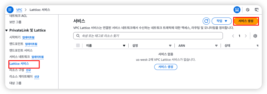 VPC > Lattice 서비스에 들어가 서비스 생성 버튼을 누릅니다.