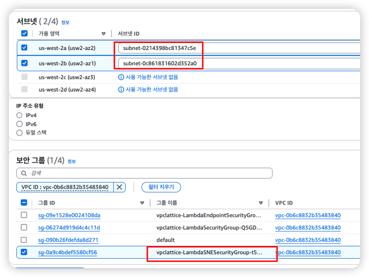 - Security groups: LambdaSNESecurityGroup 가 이름에 있는 것을 선택