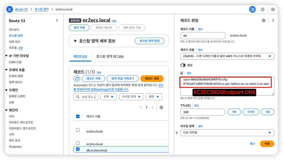 동일한 방식으로 ec2ecs.local에서는 기존 db.ec2ecs.local 레코드를 편집하고 다음 내용을 넣습니다.
