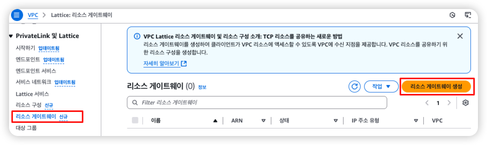 VPC Lattice에서 리소스 게이트웨이를 생성합니다.
