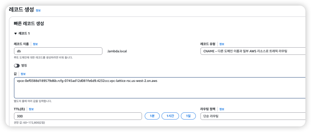 db레코드를 CNAME으로 등록하고 앞서 만든 Consumer VPC에 있는 RDS 엔드포인트용 DNS를 입력하고 생성합니다.