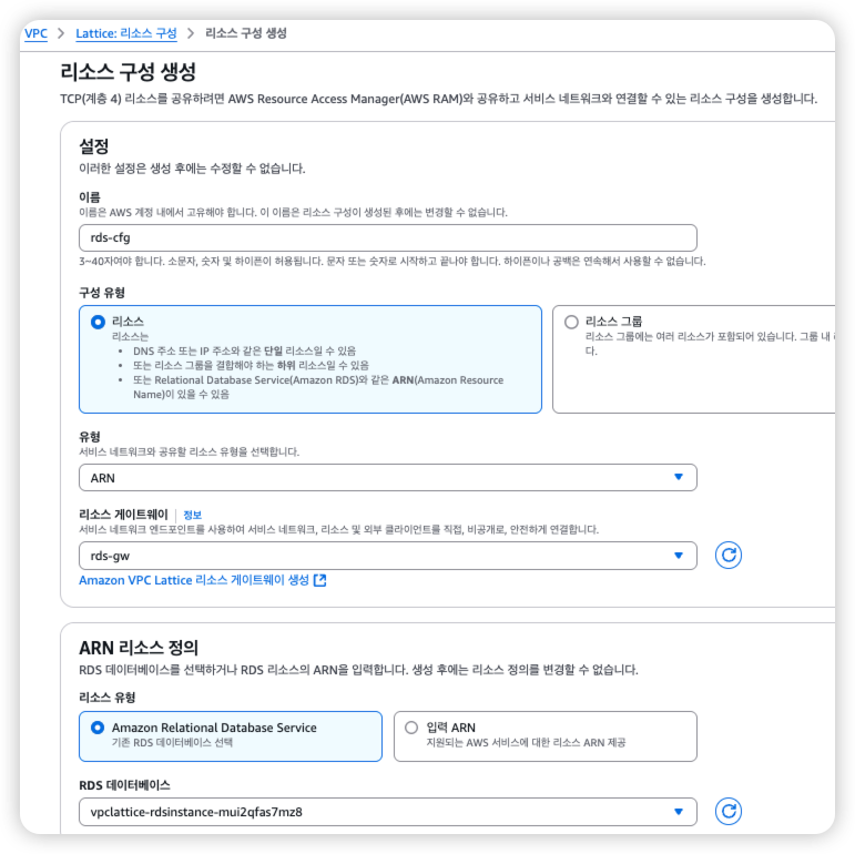 - rds-cfg - 필요한 VPC에서 엔드포인트를 생성하고 RDS를 서비스 네트워크와 연결하는 데 사용되는 리소스 구성
