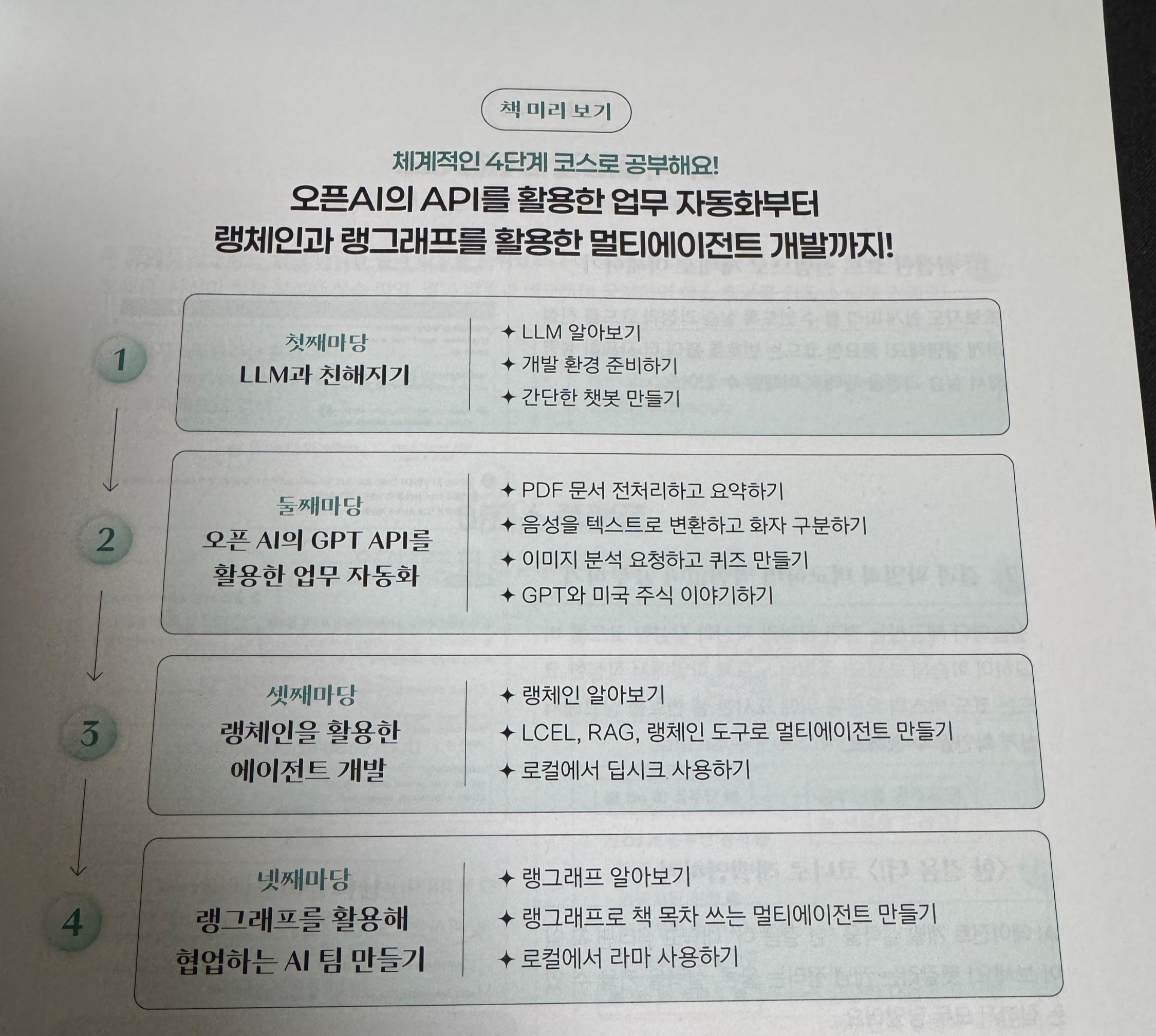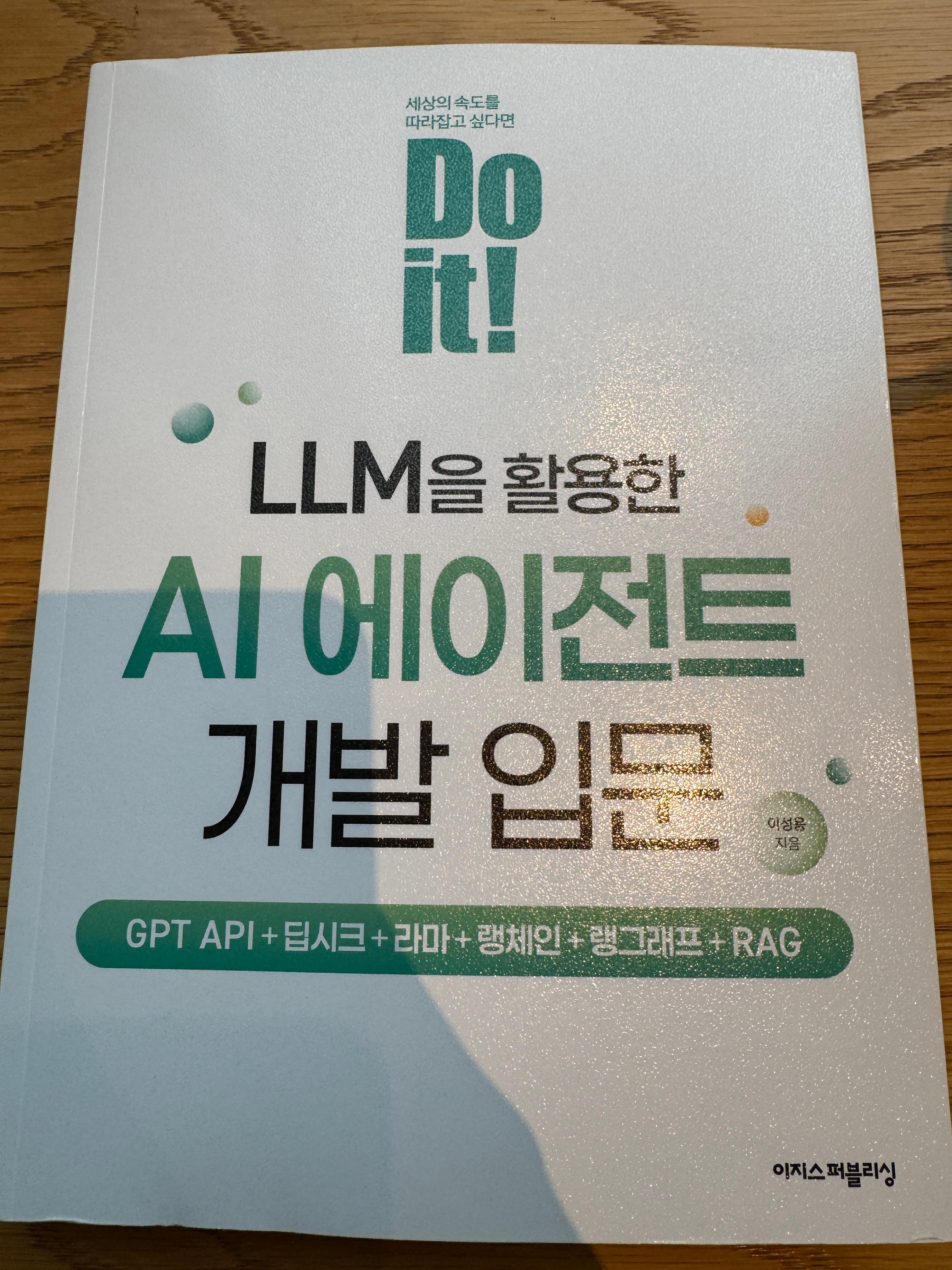 이 책의 제목 처럼 AI Agent 입문이기 때문에 에이전트로 AI를 활용하는 방법에 대해서 조금 더 초점이 맞춰진 책이라고 생각합니다.