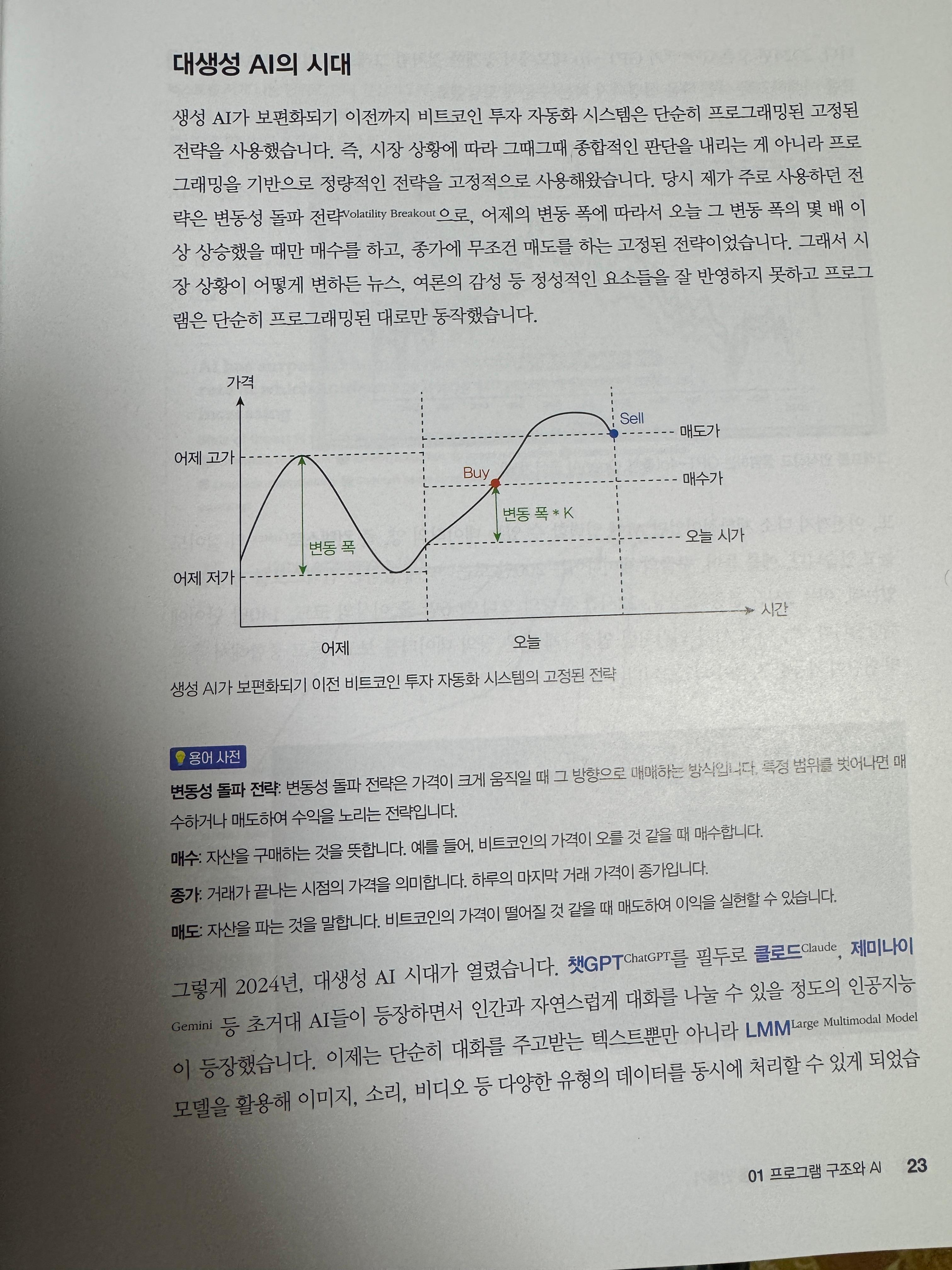 이 책은 결국은 코인 트레이딩에 대한 내용을 다루기 때문에 초반부에서는 기본적인 투자 매매법 등에 대한 설명도 간략하게 진행하고 있습니다. 해당 부분을 같이 학습할 수 있고 해당 주제들을 잡아서 LLM 모델에 질문을 통해서 통찰력을 늘려나가는 것도 큰 방법이라 고 생각합니다.